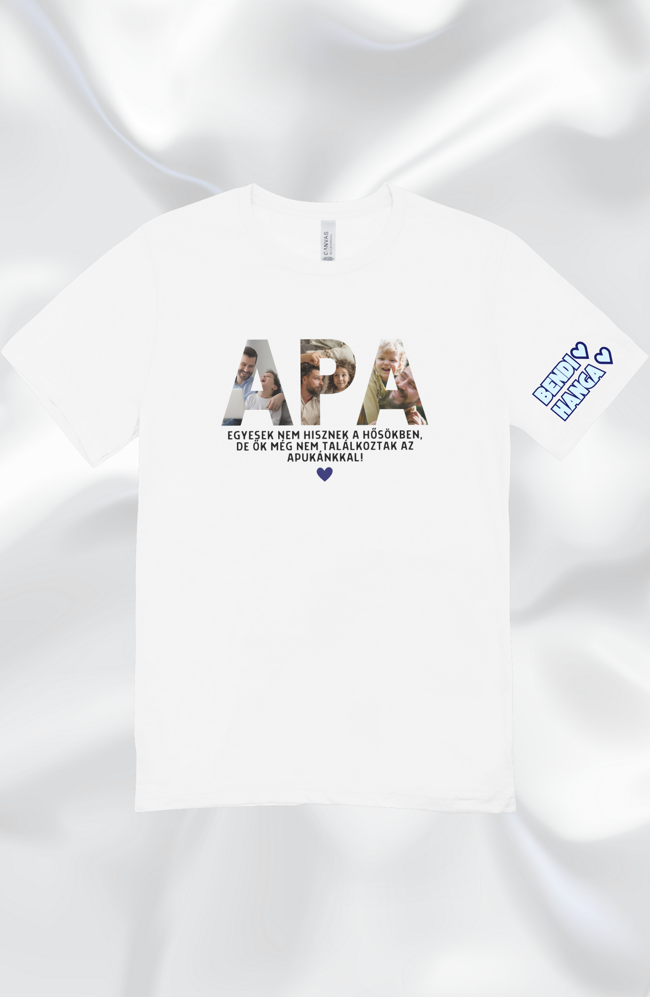 Az „APA” betűibe saját családi fotókat tölthetsz fel, így a póló egyedi és szívhez szóló lesz. 📷✨
