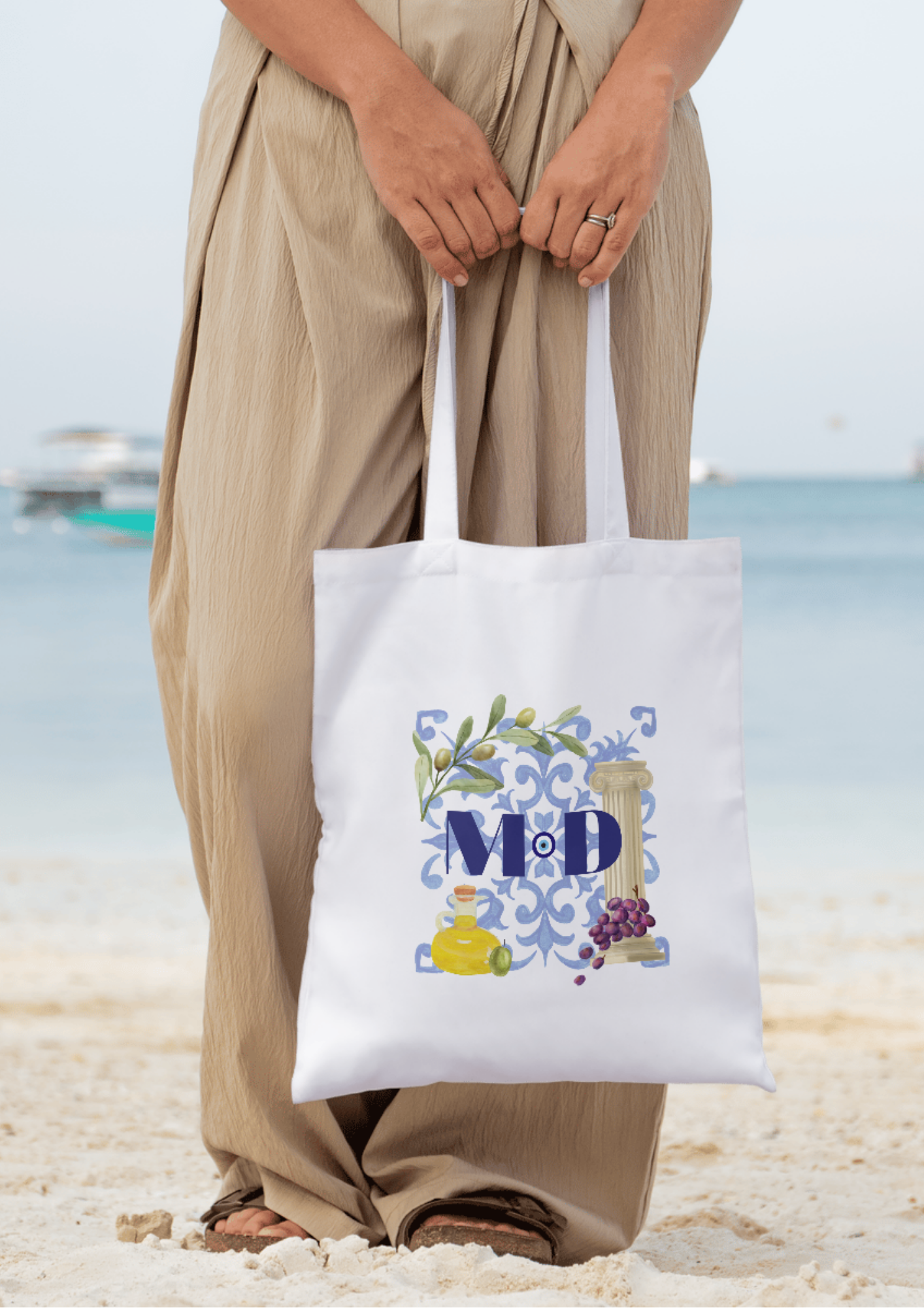 Szerezd meg a saját Mykonos monogramos emléktáskád, és viseld magaddal a görög nyár ígéretét – bárhová is sodor a szél! 🍇🌊🧿