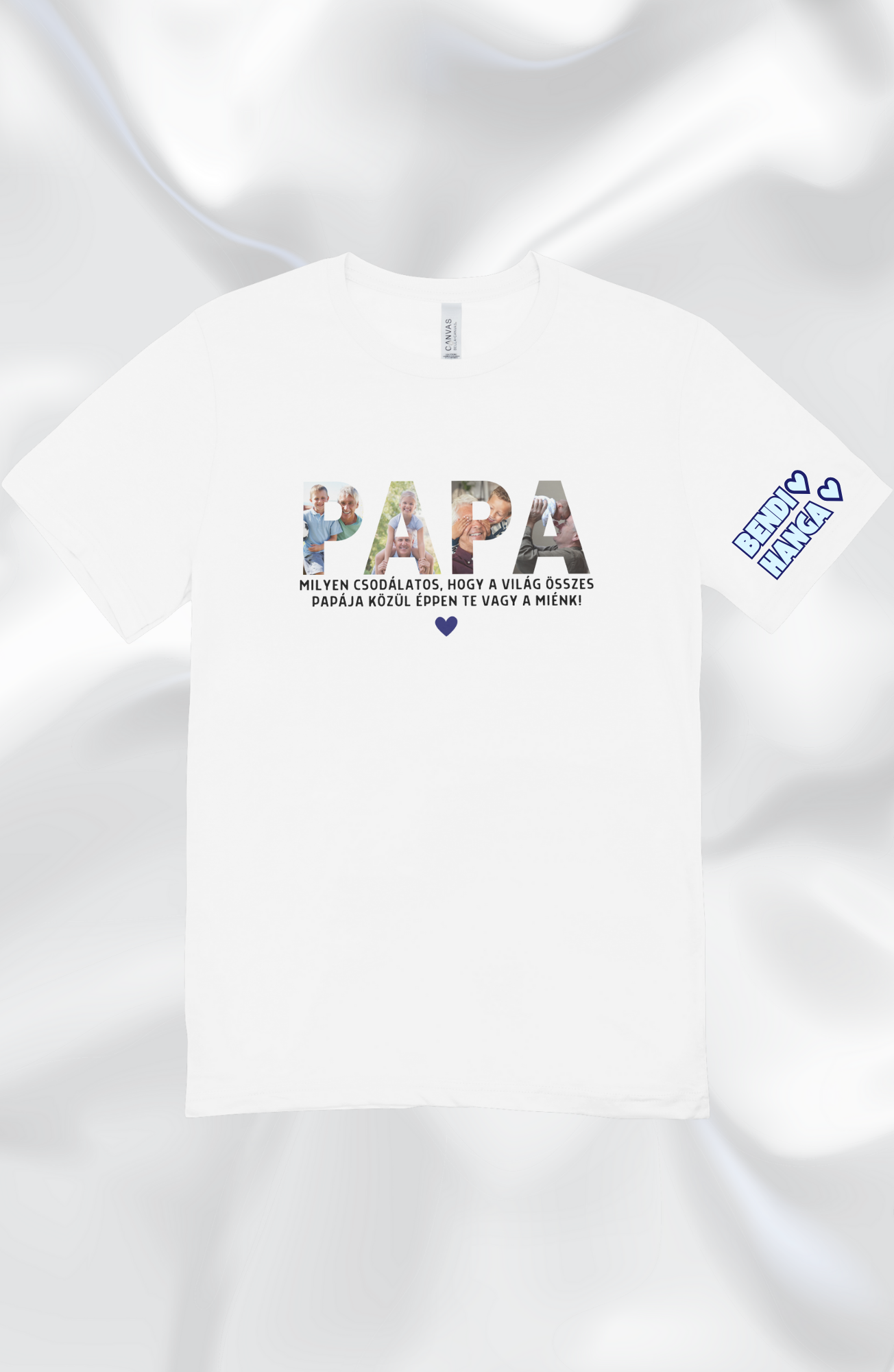 Ajándékozd meg Papát egy olyan pólóval, amely egyszerre kényelmes, stílusos és szívhez szóló emlék! 🎁 A Papa feliratos emlékpóló tökéletes választás, ha egy személyes és különleges meglepetést keresel. A „PAPA” felirat betűibe saját fotóid kerülnek, az ujján pedig megjelennek a gyermekek vagy unokák nevei kis szívecskékkel kiegészítve – szeretettel a részletekben. 💖